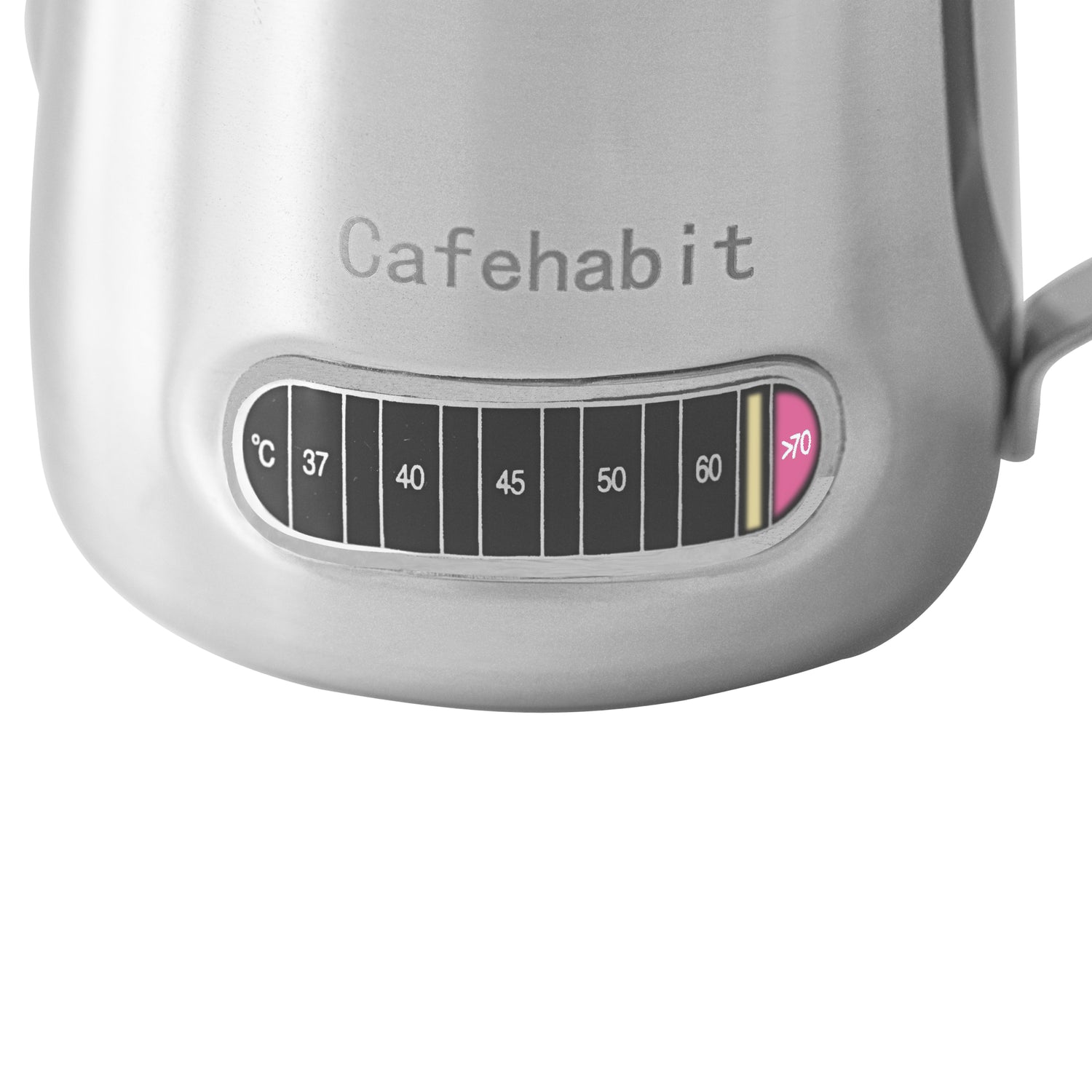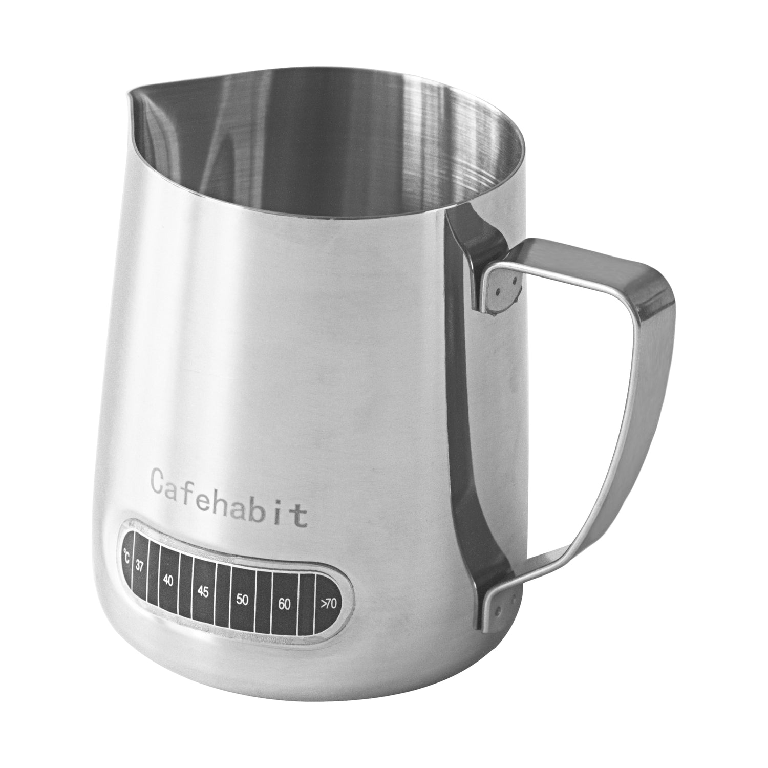 The milk jug features a precision-grade Celsius-only thermometer strip with clear numerical markings from 37°C to 70°C—optimized for perfect milk texturing.